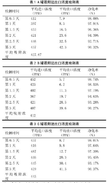 本設(shè)施采用兩吸一脫模式進(jìn)行廢氣處理,每個炭罐的裝載炭量為3噸,即時刻保持6噸的吸附炭容量。在抽風(fēng)狀態(tài)不變、生產(chǎn)狀態(tài)不變的情況下,檢驗單個罐的處理效果。企業(yè)車間每天運行12小時,實際風(fēng)量為18000m3/h。分別對每個罐進(jìn)行連續(xù)三天檢測,檢測數(shù)據(jù)見表1、表2、表3。