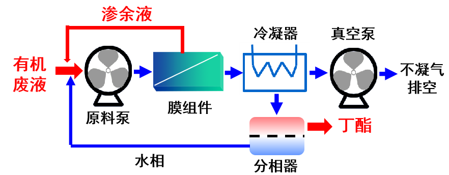 飽和的丁酯廢液經(jīng)過原料泵循環(huán)通過膜組件,在膜中滲透汽化,經(jīng)冷凝器將氣體冷卻成液體,流向分相器中,上層為丁酯可以回用,下層為飽和丁酯溶液再返回原料側進行循環(huán)處理。