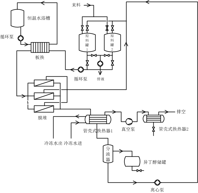 飽和的正丁醇廢液經(jīng)過原料泵循環(huán)通過膜組件,在膜中滲透汽化,經(jīng)冷凝器將氣體冷卻成液體,流向分相器中,上層為正丁醇可以回用,下層為飽和正丁醇溶液再返回原料側進行循環(huán)處理。
