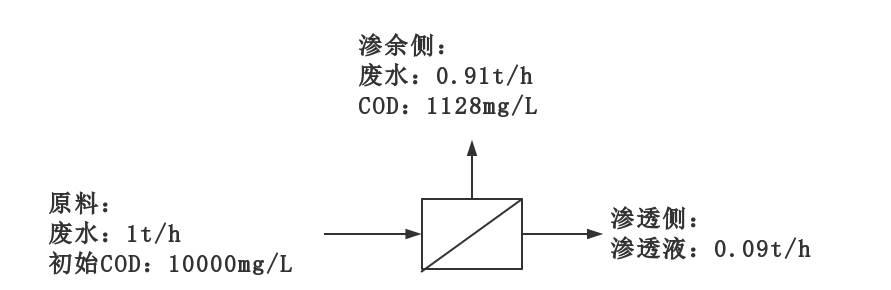 從物料守恒圖中,原料初始COD150000mg/L,經(jīng)過膜工藝處理之后,滲余測COD降至4290mg/L,這部分進入生化處理,滲透側的廢水交給第三方處理。
