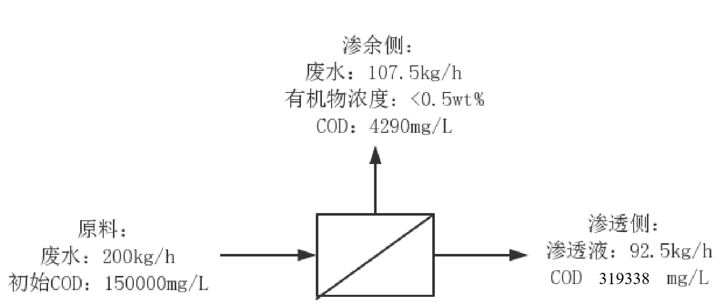 本套技術方案中涉及的廢水減量設備的處理能力按照200 kg/h來設計,廢水初始濃度為15 wt%,初始COD值約為150000 mg/L。